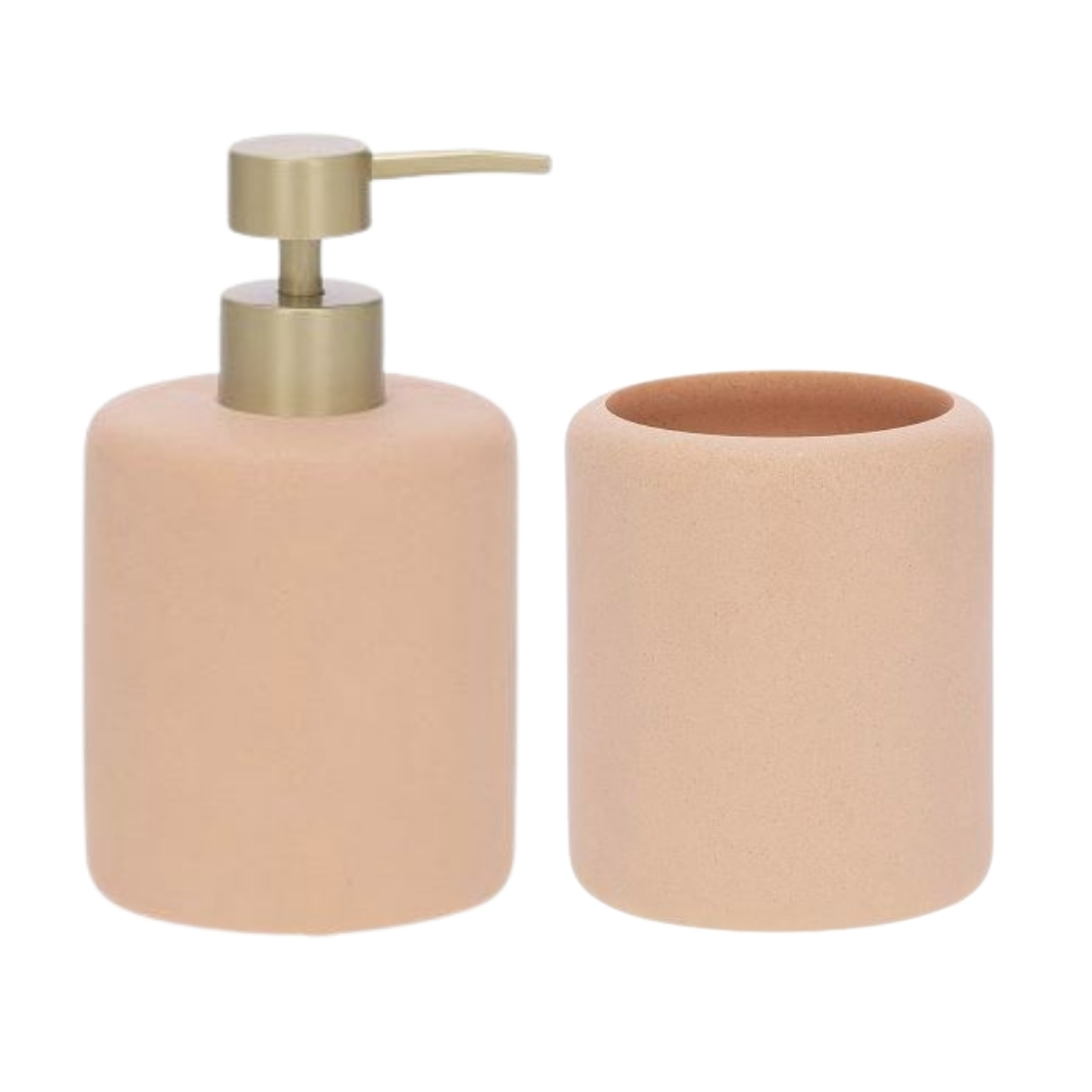Para criar uma atmosfera charmosa e acolhedora, combine o Kit Lavabo Poliresina Rose com bandeja em MDF nude, aromatizador com varetas douradas e uma vela perfumada em tom neutro. Adicione pequenas flores claras ou secas para dar um toque ainda mais romântico e sofisticado ao seu lavabo.